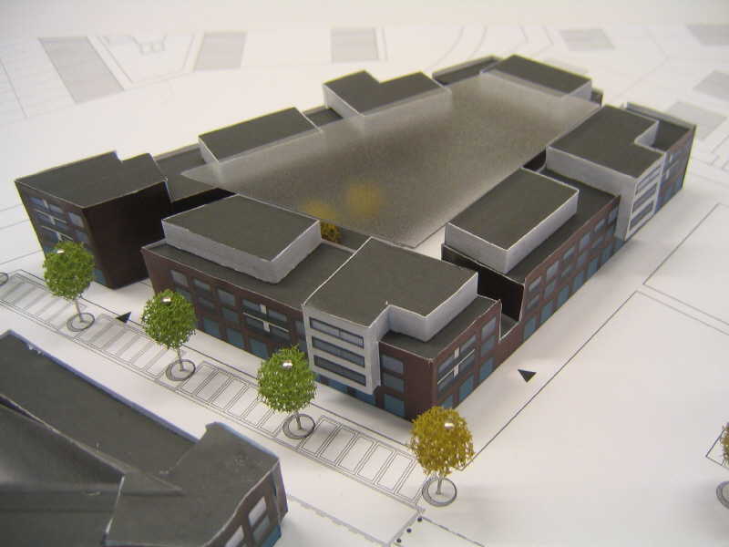 Blok B 't Thaal - ca. 2.900 m2 commerciele ruimte, 10 koop- en 40 huurappartementen en een parkeergarage met 56 plaatsen. "Binnenplein" wordt overkapt met een glazen atriumkap. Gemeente Echt-Susteren. Architect van aken architecten Eindhoven. Opdrachtgever VastGoed-2-Duizend Projecten BV Reuver.